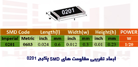 اگر ابعاد نوک مداد معمولی 0.5 میلیمترmm باشد ابعاد مقاومت اس ام دی 0201 کمی بزرگ‌تر از نوک مداد است.