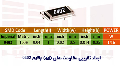 این نوع مقاومت SMD سری 0402 تکنولوژی پیچیده تری به دلیل ابعاد کوچک خود دارد و در دو استانداردEIA امپریال و متریک با واحدهای اینچ و میلیمتر در دو کد عددی متفاوت تولید می شود.
